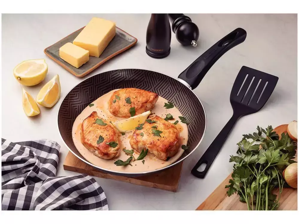 Com a praticidade da Frigideira 28500622 da Linha Paris da Tramontina você tem um mundo de receitas rápidas e fáceis. Uma frigideira funda, com o corpo de alumínio e espessura de 1,8mm que proporciona cozimento rápido e uniforme. Revestimento interno e externo de antiaderente Starflon Max que não gruda, é fácil de limpar, mais durável e não é prejudicial à saúde, pois é livre de PFOA. Cabo de baquelite antitérmico que oferece segurança durante o manuseio. Espátula de Nylon que permite uso em temperaturas de até 180 °C e cabo com furo passante possibilitando que seja pendurado na sua cozinha. Podem ir à máquina de lavar louças facilitando seu dia a dia. Essa embalagem acompanha 1 frigideira com diâmetro de 22cm, na cor chumbo e 1 espátula.